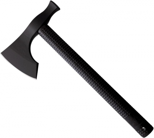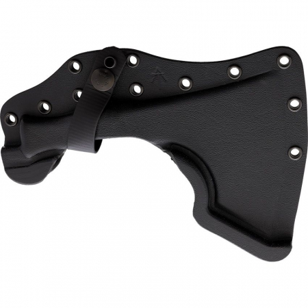 14" overall. 6.5" black coated 1060HC steel axe head with 4.13" cutting edge. Black sculpted nylon handle. Hammer poll. Black Kydex belt sheath. Boxed.