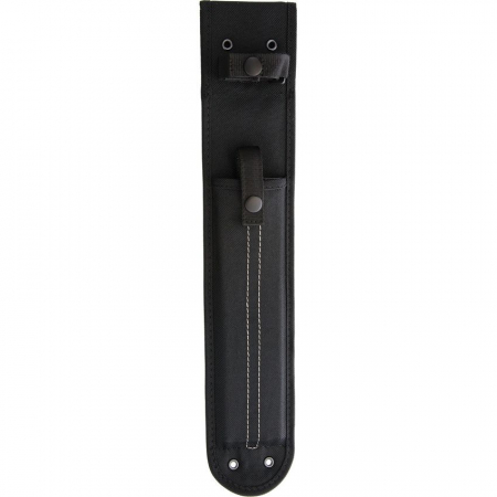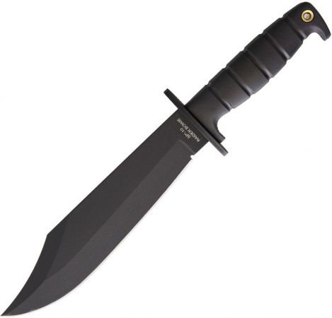 15" (38.1cm) overall. 9.5" (24.13cm) black powder coated 1075HC steel clip point blade. Black grooved Kraton handle. Stainless guard. Lanyard hole. Full tang. Black nylon belt sheath. Boxed.
