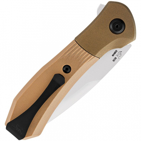 4.38" (11.13cm) closed. 3" (7.62cm) satin finish S35VN stainless drop point blade. Brown textured G10 handle. A/O. Extended tang. Pocket clip. Cerakote coated rotating bolster. Boxed.
