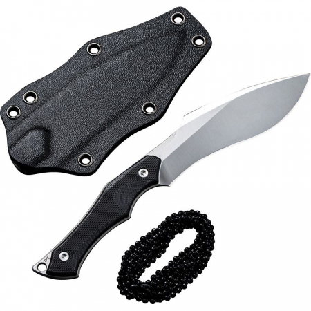 6.25" (15.88cm) overall. 3.25" (8.26cm) satin finish Nitro V steel blade. Black G10 handle. Full, extended tang. Lanyard hole. Ball chain lanyard. Black Kydex neck sheath. Boxed.