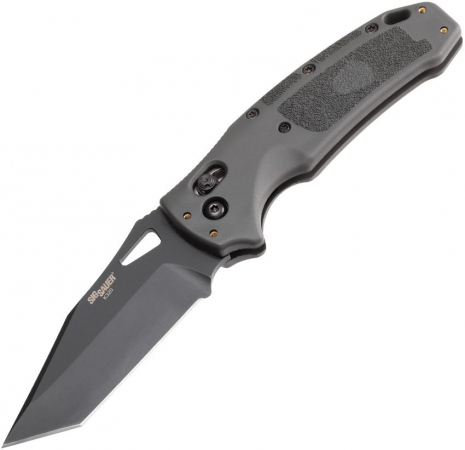 4.5" (11.43cm) closed. 3.5" (8.89cm) black Cerakote finish CPM S30V stainless tanto blade. Gray GRN handle. Thumb pull. Lanyard hole. Pocket clip. P320 texture handle. Firearm match: P320. Boxed.