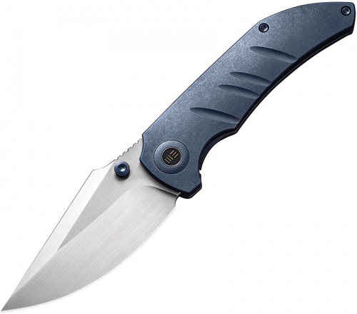 4.13" (10.49cm) closed. 3.13" (7.95cm) satin finish CPM-20CV stainless blade. Blue stonewash finish titanium handle. Thumb stud. Pocket clip. Black nylon zippered storage case. Boxed.