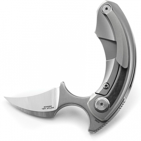 3.5" (8.89cm) closed. 2.13" (5.41cm) satin finish Bohler M390 stainless blade. Gray titanium handle with shredded carbon fiber inlay. Extended tang. Pocket clip. Black nylon zippered storage case. Boxed.