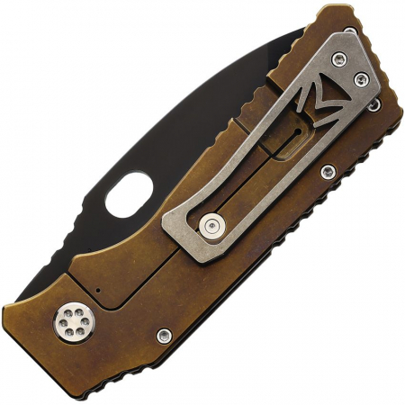5.5" closed. 4" black PVD coated D2 tool steel drop point blade. Bronze anodized titanium handle. Thumb pull. Lanyard hole. Pocket clip. Water tight storage case. Boxed.