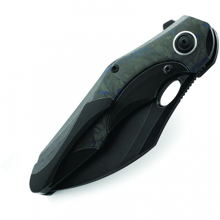 4.63" (11.76cm) closed. 3.38" (8.59cm) black stonewash finish Bohler M390 stainless blade. Black stonewash finish titanium handle withbBlack and blue marble carbon fiber inlay. Extended tang. Pocket clip. Thumb pull. Design by Kombou. Black nylon zippered storage case. Boxed.