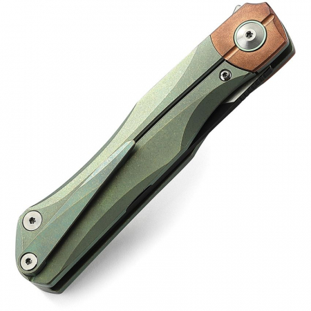 4.75" (12.07cm) closed. 3.5" (8.89cm) black stonewash and satin finish Bohler M390 stainless blade. Retro green titanium handle with red copper inlay. Extended tang. Pocket clip. Design by Kombou. Black nylon zippered storage case. Boxed.