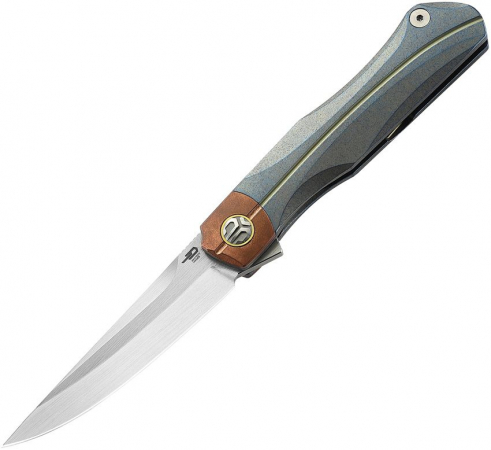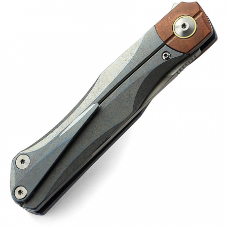 4.75" (12.07cm) closed. 3.5" (8.89cm) Bohler M390 stainless blade. Retro blue titanium handle with copper inlay. Extended tang. Pocket clip. Horizontal satin finish blade. Design by Kombou. Black nylon zippered storage case. Boxed.
