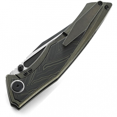 4.75" (12.07cm) closed. 3.75" (9.53cm) two-tone finish Bohler M390 stainless tanto blade. Bronze titanium handle with timascus onlay. Thumb stud. Pocket clip. Boxed.