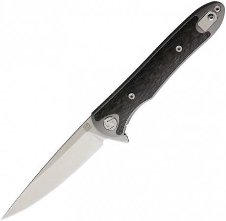 4" closed. 3" stonewash finish S35VN stainless blade. Gray anodized titanium handle with carbon fiber inlay. Extended tang. Pocket clip. Metal gift tin. Black nylon zippered storage case. Boxed.