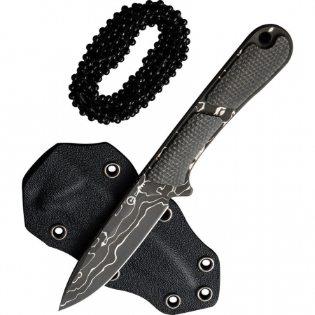 5" (12.7cm) overall. 2.25" (5.72cm) black finish Damascus steel blade. Green canvas micarta handle. Full tang. Lanyard hole. Ball chain lanyard. Black Kydex neck sheath. Boxed.