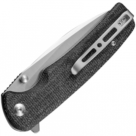 4.38" (11.13cm) closed. 3.38" (8.59cm) satin finish 9Cr18MoV stainless drop point blade. Black G10 handle. Extended tang. Thumb stud. Pocket clip. Black nylon zippered storage case. Boxed.