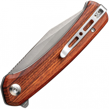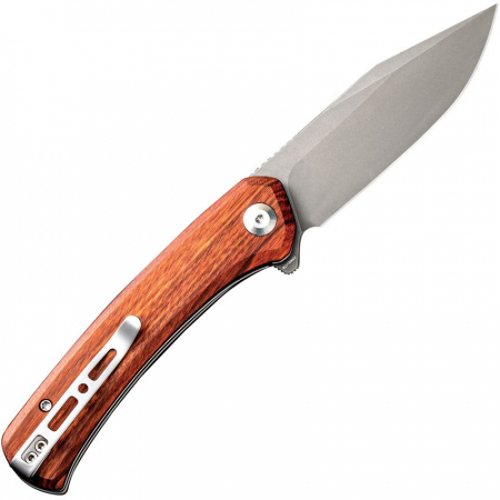 4.63" (11.76cm) closed. 3.5" (8.89cm) stonewash finish 9Cr18MoV stainless clip point blade. Extended tang. Pocket clip. Cuibourtia wood handle. Black nylon zippered storage case. Boxed.