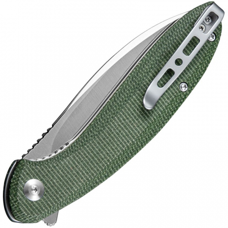 4.5" (11.43cm) closed. 3.5" (8.89cm) satin finish 9Cr18MoV stainless blade. Green canvas micarta handle. Extended tang. Pocket clip. Black nylon zippered storage case. Boxed.