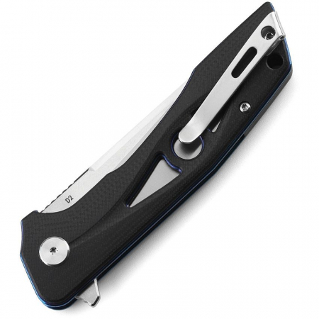 4.5" (11.43cm) closed. 3.38" (8.59cm) stonewash and satin finish D2 tool steel blade. Black G10 handle. Extended tang. Lanyard hole. Pocket clip. Boxed.