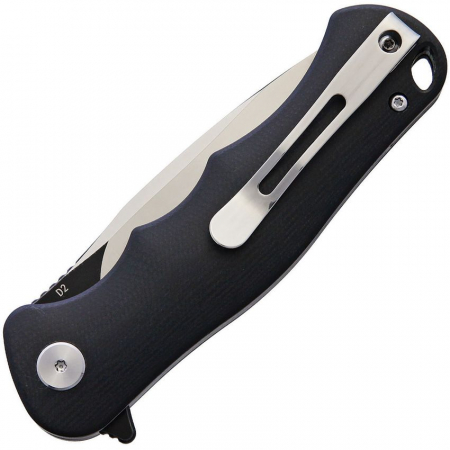 4.25" (10.8cm) closed. 3.25" (8.26cm) D2 tool steel blade. Black finger grooved G10 handle. Extended tang. Lanyard hole. Pocket clip. Black stonewash and satin finish blade. Ceramic ball bearing. Boxed.