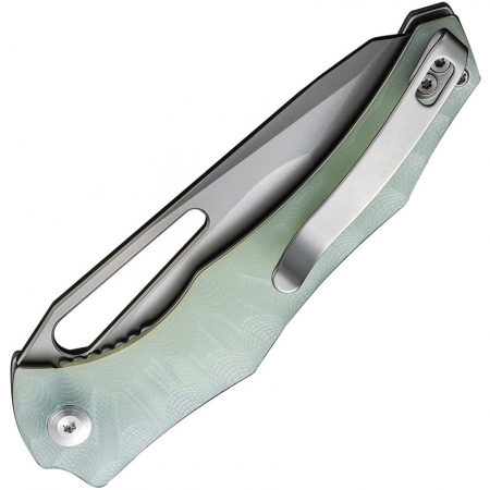 4.25" (10.8cm) closed. 3.5" (8.89cm) stonewash finish 14C28N Sandvik stainless blade. Jade sculpted G10 handle. Thumb pull. Pocket clip. Black nylon zippered storage case. Boxed.