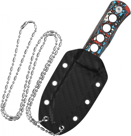 5.25" (13.34cm) overall. 2.5" (6.35cm) Damascus steel blade. Red, white, and blue carbon fiber handle. Full tang. Black Kydex neck sheath. Boxed.