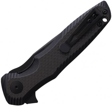 5.13" (13.03cm) closed. 3.75" (9.53cm) black TiNi coated 154CM stainless blade. Extended tang. Lanyard hole. Pocket clip. Black G10 and carbon fiber handle. Boxed.