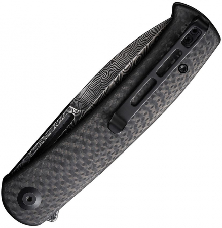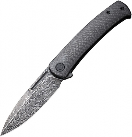 4.5" (11.43cm) closed. 3.5" (8.89cm) Stainless Damascus spear point blade. Carbon Fibre handle. Extended tang. Pocket clip. Black nylon zippered storage case. Boxed.