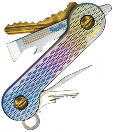 3.5" overall. Spectrum anodized titanium construction. Tools include: Pocket clip and Key fob. Screws included (to hold 4, 8, or 12 keys). Load keys in preferred order. O-rings keep keys snug and allow for adjustment of tension. Washers between keys for easy deployment. Includes link for key fob. Holds up to 12 keys. Keys and accessories not included. Hang packaged