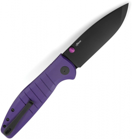 4.5" (11.43cm) closed. 3.5" (8.89cm) black DLC coated D2 tool steel blade. Purple G10 handle. Thumb stud. Lanyard hole. Pocket clip. Boxed.