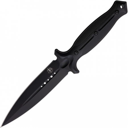 11.75" (29.85cm) overall. 6" (15.24cm) black coated double edge 1095HC steel dagger blade. Black sculpted nylon handle. Full tang. Lanyard hole. Black injection molded nylon belt sheath. Boxed.