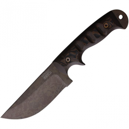 10.25" (26.04cm) overall. 4.63" (11.76cm) CPM-3V carbon steel blade. Black and orange G10 handle. Full, extended tang. Lanyard hole. Scorched earth finish blade. Black Kydex and brown leather belt sheath. Boxed.