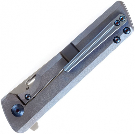 4.13" (10.49cm) closed. 3.13" (7.95cm) satin finish S35VN stainless tanto blade. Blue orange peel titanium handle. Extended tang. Pocket clip. Black nylon pouch. Boxed.