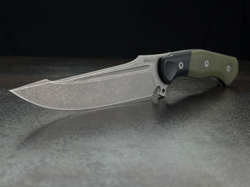 12" (30.48cm) overall. 6.38" (16.21cm) tumbled finish 14C28N Sandvik stainless blade. Green and black G10 handle. Full tang. Harpoon tip blade. Black FRN belt sheath. Boxed.