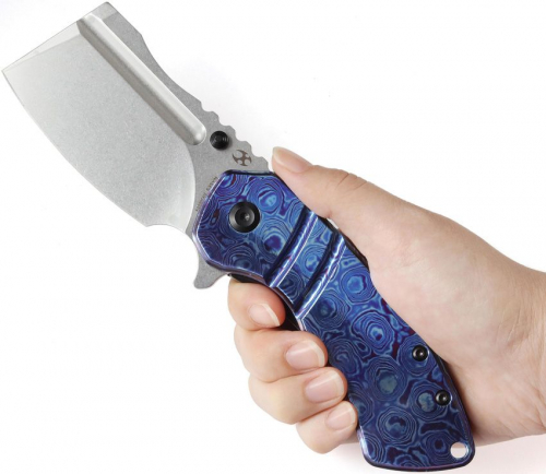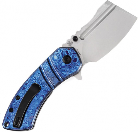 4.75" (12.07cm) closed. 3.13" (7.95cm) stonewash finish S35VN stainless cleaver style blade. Blue Timascus handle. Extended tang. Lanyard hole. Pocket clip. Thumb stud. Black nylon pouch. Boxed.
