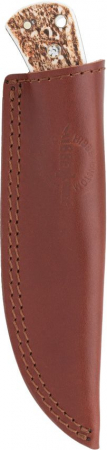 7.88" (20.02cm) overall. 3.63" (9.22cm) satin finish 7Cr17MoV stainless blade. Stag handle. Nickel silver bolster(s). Full tang. Lanyard hole. Brown leather belt sheath. Boxed.