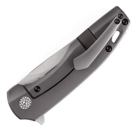 4" (10.16cm) closed. 3" (7.62cm) stonewash finish CPM S35VN stainless blade. Gray titanium handle. Extended tang. Lanyard hole. Pocket clip. Black nylon pouch. Boxed.