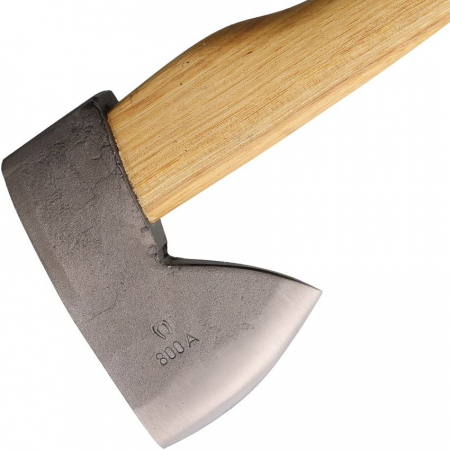 24" overall. 6.5" steel axe head with 4.5" cutting edge. Oiled Hickory handle. 800g. Brown leather belt sheath. Bulk packed.