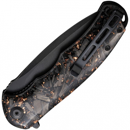 4.75" (12.07cm) closed. 3.75" (9.53cm) black stonewash finish 9Cr18MoV stainless blade. Extended tang. Pocket clip. Lanyard hole. Shredded carbon fiber and copper shred in clear resin handle. Black nylon zippered storage case. Boxed.