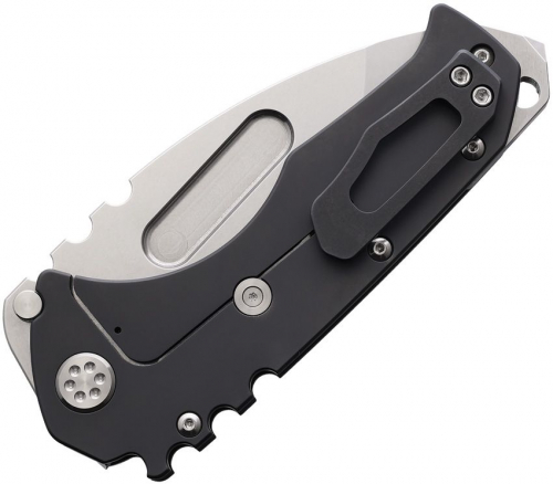 5.25" (13.34cm) closed. 3.75" (9.53cm) tumbled finish CPM-20CV stainless tanto blade. Black DLC coated titanium handle. Glass breaker. Lanyard hole. Pocket clip. Thumb stud. Black nylon zippered storage case. Boxed.