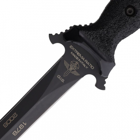 13" (33.02cm) overall. 7" (17.78cm) black MIL-C-13924 burnished double edge Bohler N690 stainless dagger blade. Black textured nylon handle. Glass breaker. Commemorative limited and numbered series of 1000 daggers, bearing both historical and current unit logos of the G. I. S., the renowned counter-terrorism unit of the Carabinieri (Italian military police). Comes in a hand-polished, clear plexiglass display case. Boxed.