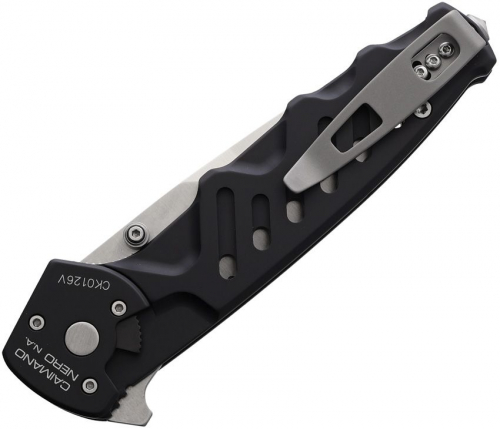 The blade is a 4 mm thick asymmetrical spear point. The serrated part of the edge allows to cut highly-resistant cables and fabrics without losing its sharpening. The bottom part of the handle is designed to enhance the grip for a rapid extraction of the knife from the pocket. It is also equipped with a hard-metal glass breaker. The DLC-coated titanium clip (the titanium clip of the CAIMANO NERO N.A. SATIN is not DLC-coated) can be positioned in three different angles on both sides allowing to conceal the knife as much as possible inside the pocket.
