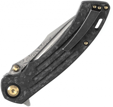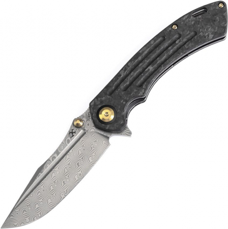 4.75" (12.07cm) closed. 3.75" (9.53cm) Damascus steel tanto blade. Twill carbon fiber handle. Extended tang. Lanyard hole. Pocket clip. Thumb stud. Black nylon pouch. Boxed.