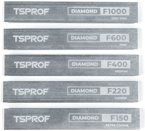 Dimensions: 6" x 1". Includes: F150 Extra coarse; F220 Coarse; F400 Medium; F600 Fine; F1000 Very fine. Do not require soaking. Can be used dry. Boxed.