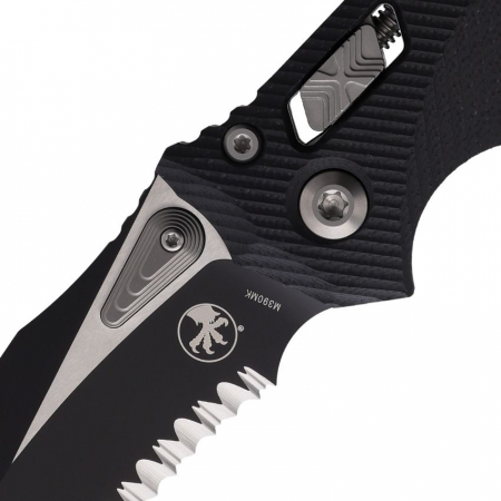 5.38" (13.67cm) closed. 4" (10.16cm) two-tone finish partially serrated Bohler M390MK stainless blade. Black G10 handle. Pocket clip. Lanyard hole. Unique thumb stud opener with ball bearing pivot. Microtech item #137RL-2FLGTBK. Boxed.