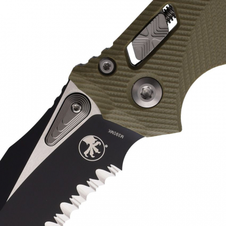 5.38" (13.67cm) closed. 4" (10.16cm) two-tone finish partially serrated Bohler M390MK stainless blade. OD green G10 handle. Pocket clip. Lanyard hole. Unique thumb stud opener with ball bearing pivot. Microtech item #137RL-2FLGTOD. Boxed.