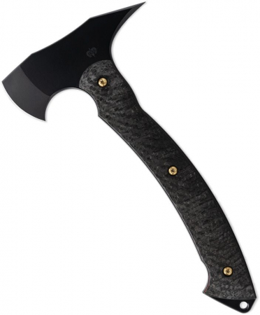 11" overall. 5.75" black Gun-Kote finish D2 tool steel axe head with 2.75" cutting edge. Black G10 handle. Full, extended tang. Lanyard hole. Weight: 1.3lb. Spike end. Double recurve handle. FlexTech Kydex belt sheath. Black Kydex belt sheath. Boxed.