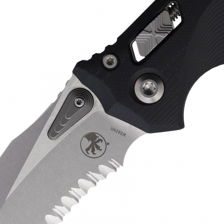 5.38" (13.67cm) closed. 4" (10.16cm) stonewash finish partially serrated Bohler M390MK stainless blade. Black G10 handle. Pocket clip. Lanyard hole. Frag pattern handle. Unique thumb stud opener with ball bearing pivot. Microtech item #137RL-11FRGTBK. Boxed.