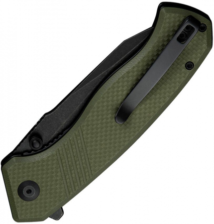 5" (12.7cm) closed. 3.75" (9.53cm) black stonewash finish 14C28N Sandvik stainless clip point blade. OD green textured G10 handle. Extended tang. Thumb stud. Pocket clip. Black nylon zippered storage case. Boxed.