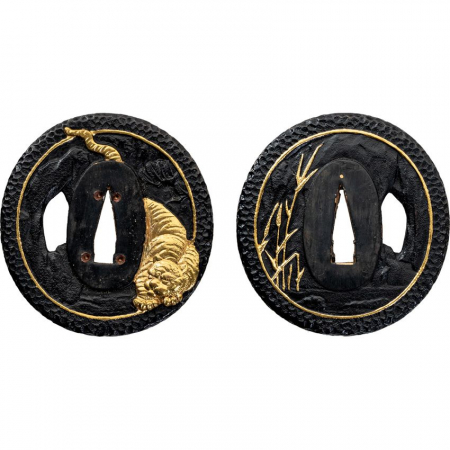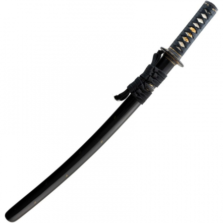 26.25" (66.68cm) overall. 19.5" (49.53cm) K120C powder steel blade. Differentially tempered with a traditional claying method to the grain patter (hada) showing distinct layers. The temper line (hamon) is evident and prominent. The blade features groove (bo-hi) on both sides. The tsuba is made from blackened iron depicting a "stalking tiger" inlaid in brass. The ray skin (same) is covered on the handle (tsuka) with Japanese Cotton. The saya is deeply lacquered in black and inlaid with brass bamboo leaves. Boxed.