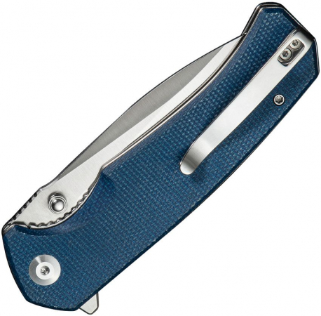4.88" (12.4cm) closed. 3.75" (9.53cm) satin finish 9Cr18MoV stainless drop point blade. Blue canvas micarta handle. Extended tang. Thumb stud. Pocket clip. Boxed.