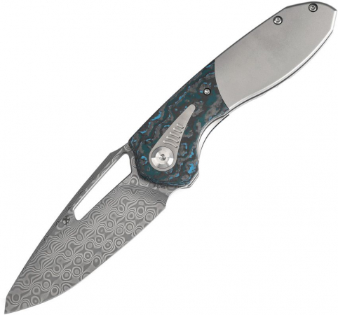 4.63" (11.76cm) closed. 3.38" (8.59cm) Damascus steel clip point blade. Gray titanium handle with Arctic Storm Fat carbon fiber inlay. Thumb pull. Pocket clip. Black nylon pouch. Boxed.