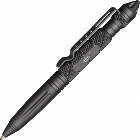 6 1/8" overall. Knurled gun metal gray anodized aircraft aluminum housing. Gun metal gray finish stainless pocket clip with drilled hole design. Unscrew glass breaker/self defense top to reveal handcuff key. Black ink. Accepts standard Parker and Fisher Space Pen refills.