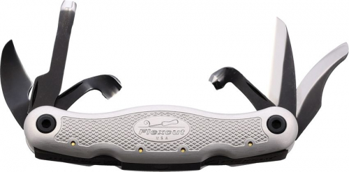 4.25" (10.8cm) closed. High carbon stainless blade. Silver aluminum handle. Right hand version. Detail knife, Straight gouge, Hook knife, V-Scorp, Gouge scorp, Pelican knife. Includes Slipstrop and FlexCut Gold polishing compound. Natural leather belt sheath. Clam