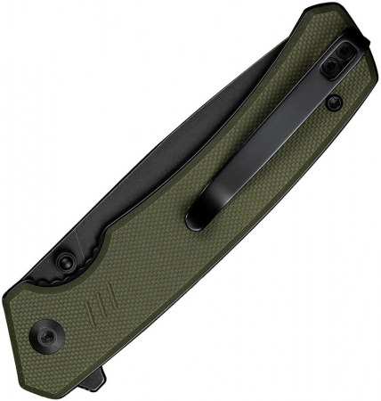 4.25" (10.8cm) closed. 3.25" (8.26cm) black stonewash finish 14C28N Sandvik stainless drop point blade. OD green G10 handle. Extended tang. Thumb stud. Pocket clip. Black nylon zippered storage case. Boxed.